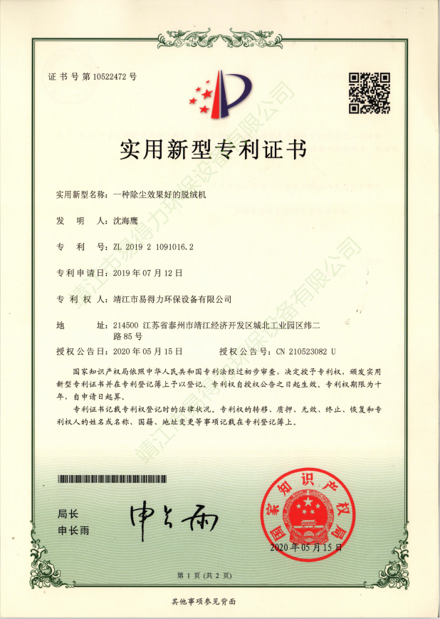 專利證書本公司坐落于開放開發(fā)超前城市江蘇靖江,我們精良優(yōu)秀設(shè)計(jì)團(tuán)隊(duì)始終遵循著創(chuàng)新超越的理念,贏得了中外合資企業(yè)的信賴。易得力環(huán)保設(shè)備有限公司與上海環(huán)科院等科研單位保持合作關(guān)系,不斷加大自身的科研力量,集中了一批國內(nèi)環(huán)境科技研究和應(yīng)用方面的高素質(zhì)人才,取得多項(xiàng)實(shí)用新型專利證書。…… 查看更多 >>